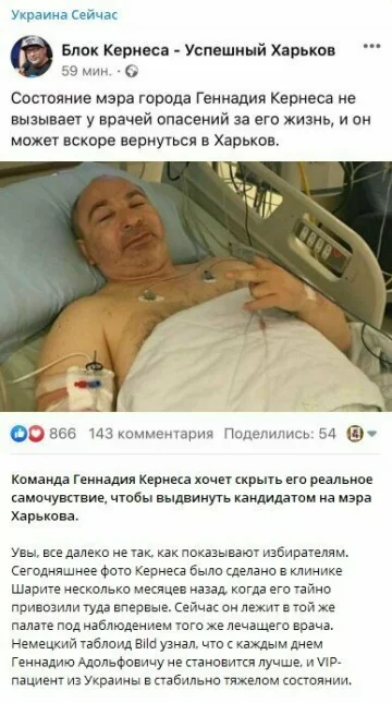 У мережі пишуть, що зроблений цей кадр дійсно в німецькій клініці Шаріте, але не у вересні 2020-го, а кілька місяців тому, коли Кернеса таємно привезли в цю клініку в перший раз.
