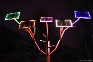 Вони розповіли про принцип роботи об’єкта, який полягає в тому, що енергія сонячних панелей заряджає акумулятор, розташований в нижній частині «дерева». Це дозволяє накопичити енергію в денний час і використовувати її. Об’єднання сонячних панелей (фотоелементів) – напівпровідникових пристроїв, прямо перетворює сонячну енергію на постійний електричний струм.